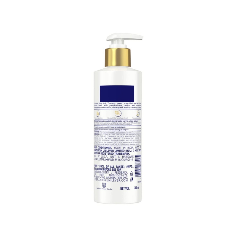 Wondering how to help make hair stronger and reduce hair fall all at once? Discover Dove Hair Therapy, Dove Hair Therapy Breakage Repair Conditioner expert care that reaches hairs cellular level, with moisturising potion and nourishing ingredients. We are all about those good hair days but hair fall can make us feel less than our beautiful best. Thats why we created Hair Therapy Breakage Repair conditioner for damaged hair. Giving your hair expert care it deserves, this strengthening conditioner blends all the care of Dove you know and love. Infused with Nutri-lock serum, this conditioner for damaged hair is inspired by the world of luxury skin care. It gives care at hairs cellular level and boosts hair strength - helping your hair look thicker, stronger, and healthier. Our expert yet gentle caring formula contains no parabens & dyes which makes it suitable even for coloured hair. Try it today for beautiful, healthy-looking strands with 98% less breakage** and say hello to good hair days every day. After shampooing, apply from the mid lengths to the tips of your hair. Massage it in and leave for a minute or two while it works its magic. Then, rinse thoroughly. Bottle made from 25% recycled plastic so you can be kind to your hair and the environment. CRUELTY-FREE HAIR CARE: Globally, Dove does not test on animals **When used as a system vs. non-conditioning shampoo