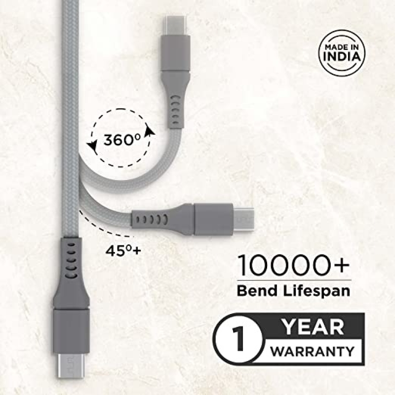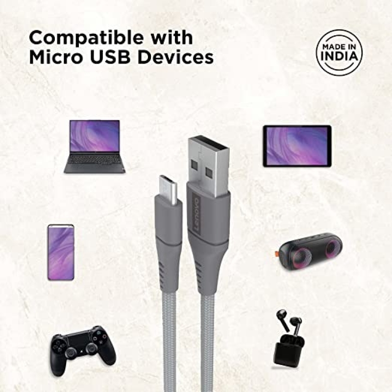 Lenovo Micro USB Tangle-free Aramid fiber braided 1m cable with 4A charging & 480 MBPS data transmission, certified 10000+ bend lifespan, Metallic Grey