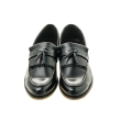 A pair of Black solid pointed toe formal slip-ons has tassel moccasin, has a slip-on closure