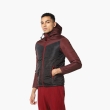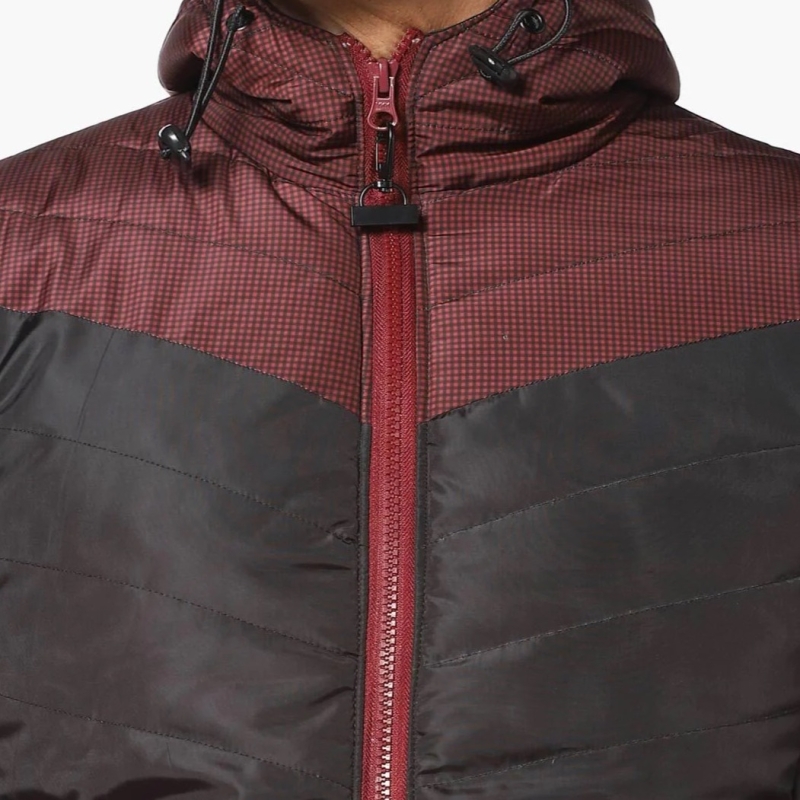 Maroon and Black colourblocked jacket, has a hooded, 2 pockets, zip closure, long sleeves, straight hem, and polyester lining.