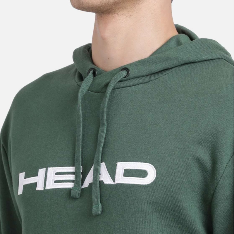 Green solid sweatshirt has a hooded, 1 kangaroo pocket pockets, long sleeves, closure, ribbed hem.
