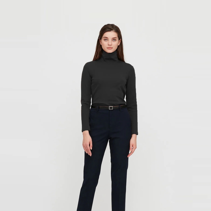 Black solid T-shirt, has a turtle neck, and long sleeves.