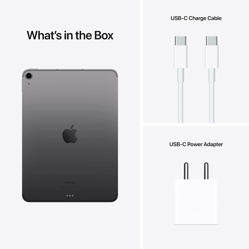 • In the Box: iPad Air, USB-C Charge Cable (1 meter), 20W USB-C Power Adapter