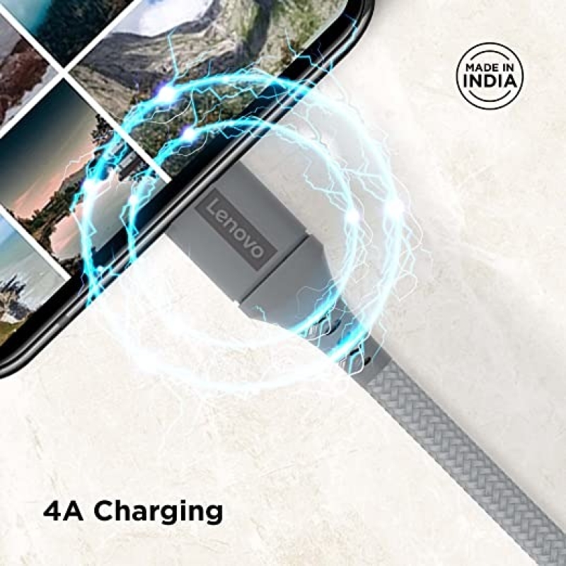 Lenovo Micro USB Tangle-free Aramid fiber braided 1m cable with 4A charging & 480 MBPS data transmission, certified 10000+ bend lifespan, Metallic Grey