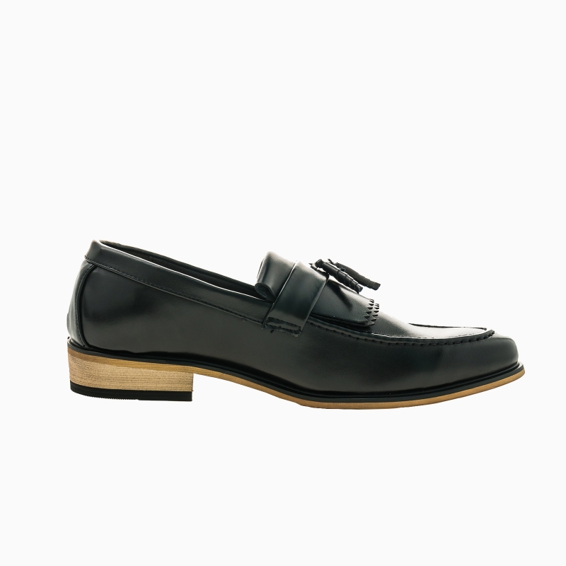 A pair of Black solid pointed toe formal slip-ons has tassel moccasin, has a slip-on closure