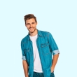 Blue solid opaque Casual shirt ,has a spread collar, button placket, 2 flap pocket, long regular sleeves, curved hem