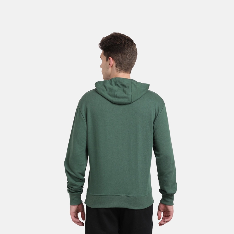 Green solid sweatshirt has a hooded, 1 kangaroo pocket pockets, long sleeves, closure, ribbed hem.