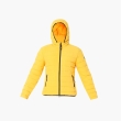 Yellow striped puffer jacket, has a hooded, 2 pockets ,has a zip closure, long sleeves, straight hemline, polyester lining.