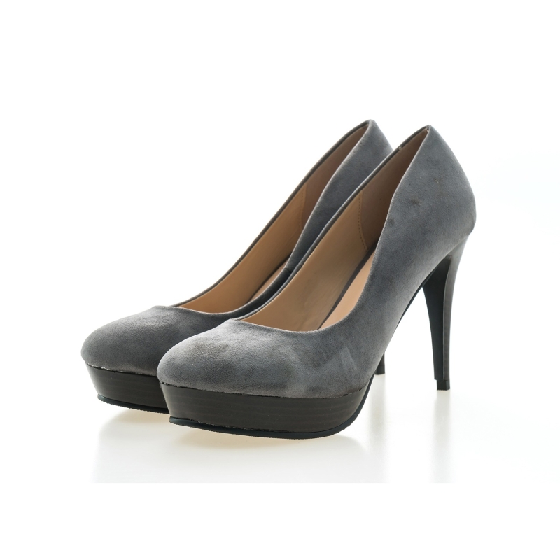 A pair of Grey solid pumps ,has regular ankle and closed back Synthetic solid upper Cushioned footbed Textured and patterend outsole, has a slim heeled